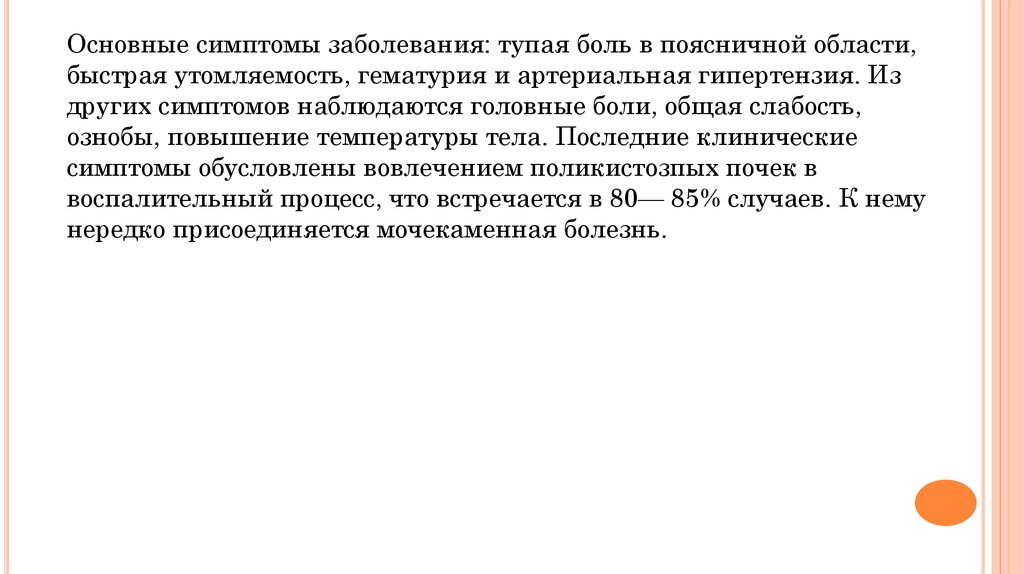 Основные симптомы заболевания: тупая боль в поясничной области,быстрая утомляемость, гематурия и артериальная гипертензия. Из