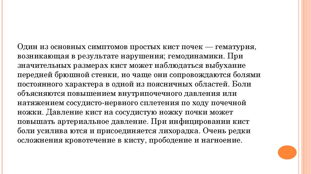 Один из основных симптомов простых кист почек — гематурия,возникающая в результате нарушения; гемодинамики. При