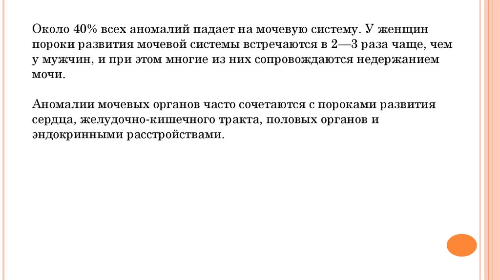 Около 40% всех аномалий падает на мочевую систему. У женщинпороки развития мочевой системы встречаются в 2—3 раза чаще, чем