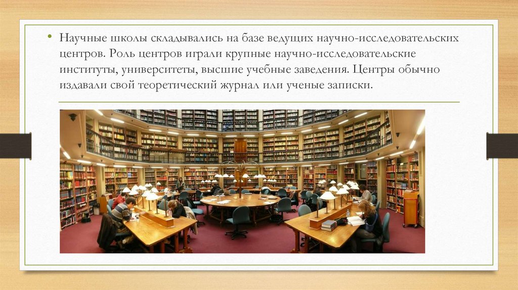 • Научные школы складывались на базе ведущих научно-исследовательскихцентров. Роль центров играли крупные научно-исследовательские
