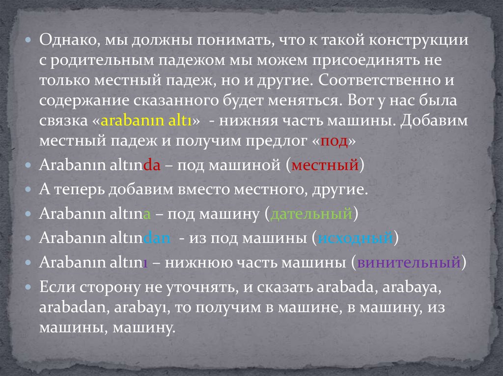 arabadan, arabayı, то получим в машине, в машину, из