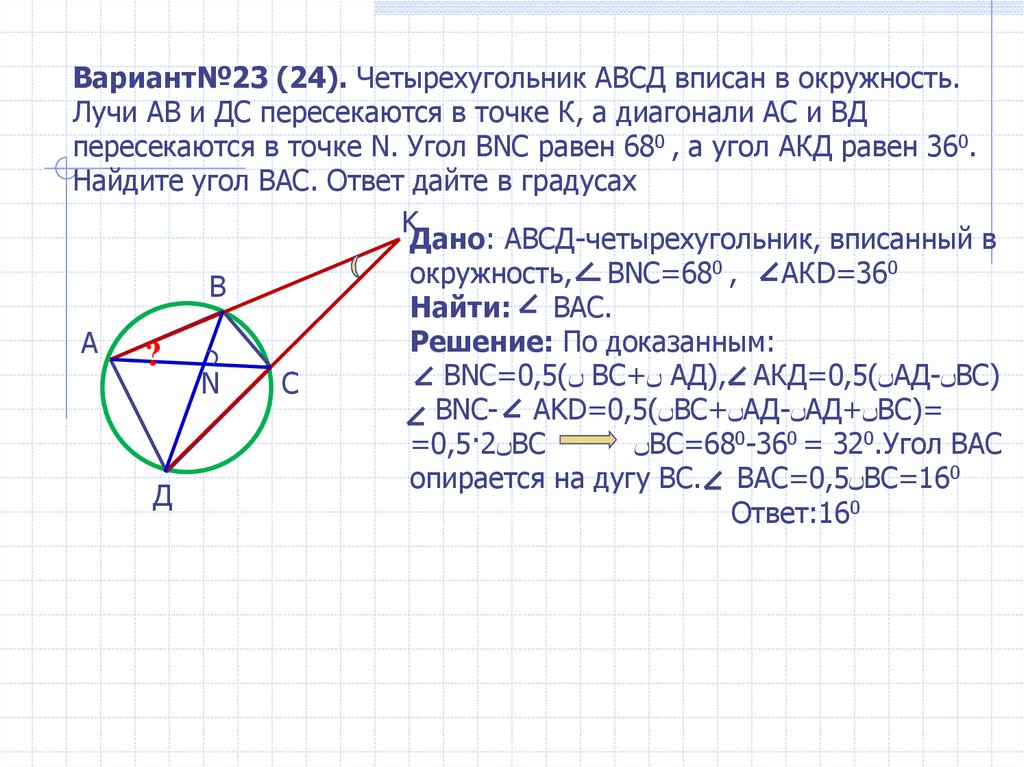 Вариант№23 (24). Четырехугольник АВСД вписан в окружность.Лучи АВ и ДС пересекаются в точке К, а диагонали АС и ВД
