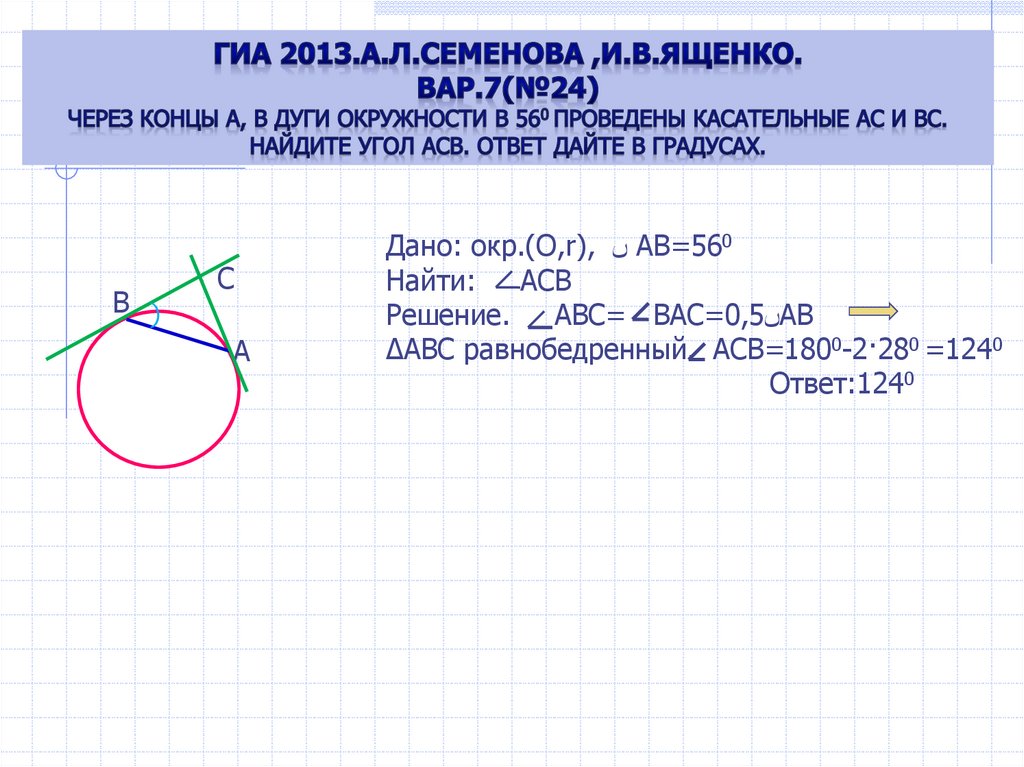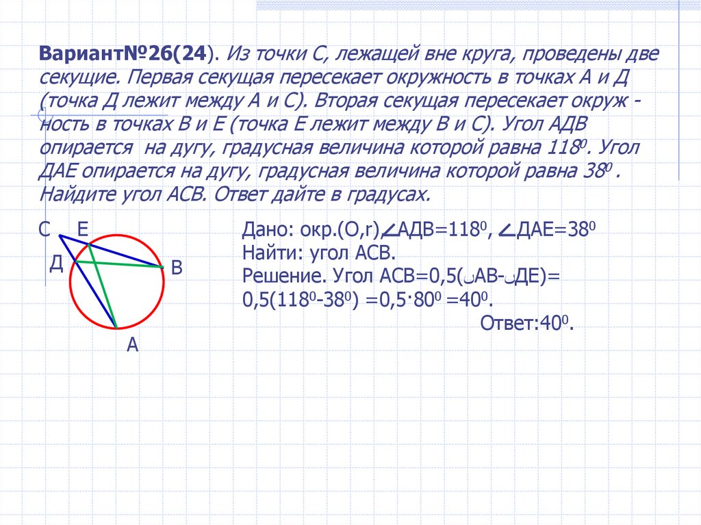 Вариант№26(24). Из точки С, лежащей вне круга, проведены двесекущие. Первая секущая пересекает окружность в точках А и Д