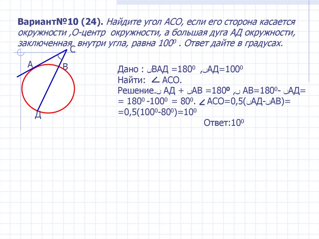 Вариант№10 (24). Найдите угол АСО, если его сторона касаетсяокружности ,О-центр окружности, а большая дуга АД окружности,