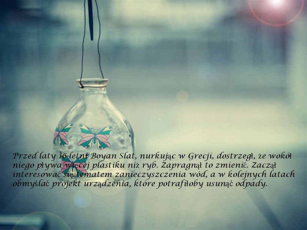 Przed laty 16-letni Boyan Slat, nurkując w Grecji, dostrzegł, że wokółniego pływa więcej plastiku niż ryb. Zapragnął to zmienić. Zaczął