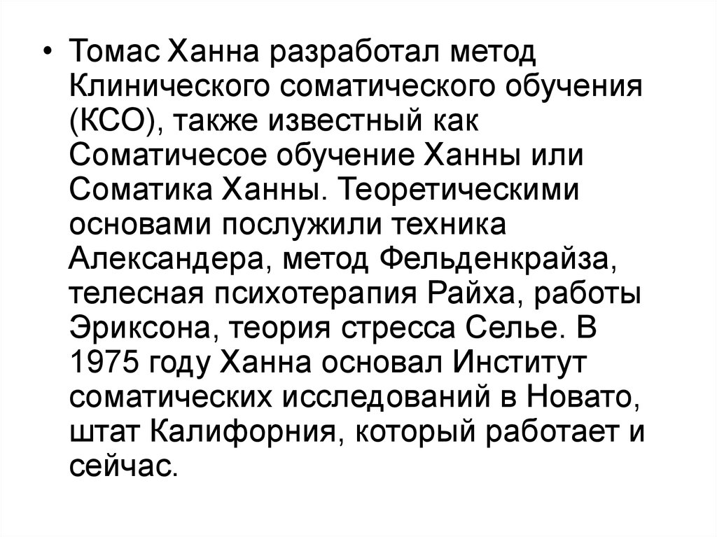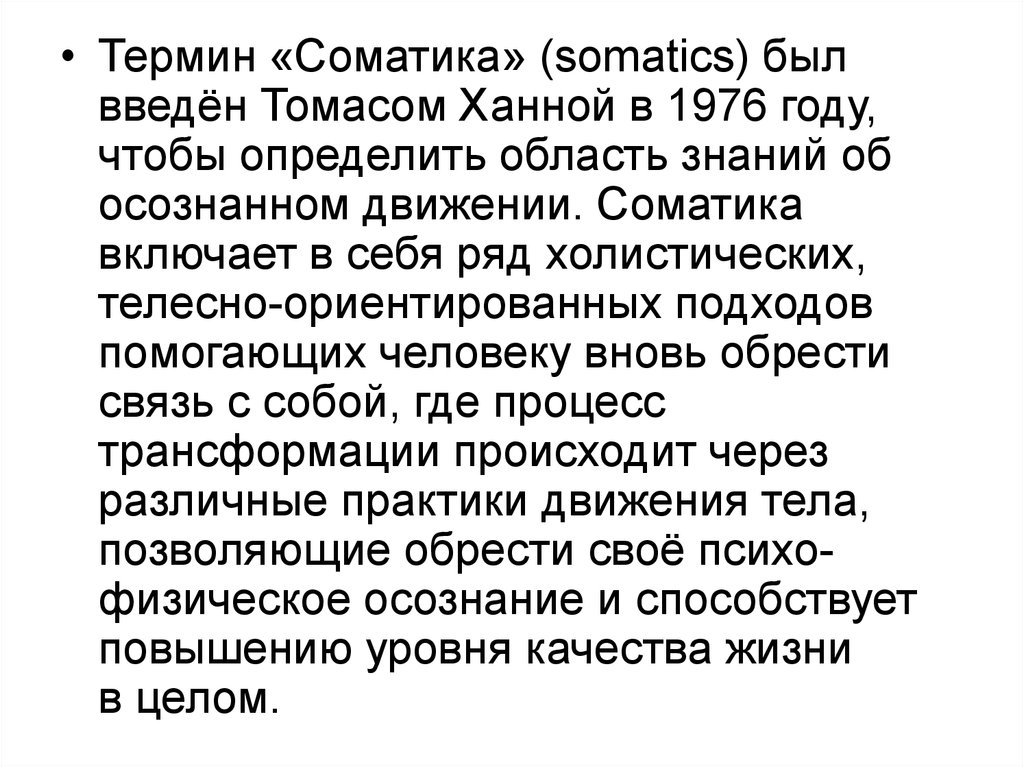 • Термин «Соматика» (somatics) былвведён Томасом Ханной в 1976 году,