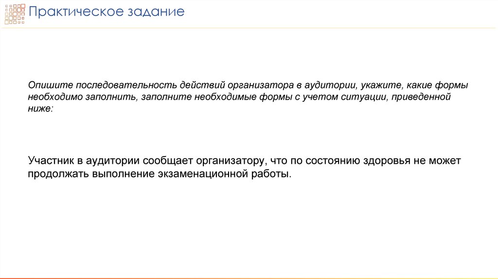 Практическое заданиеОпишите последовательность действий организатора в аудитории, укажите, какие
