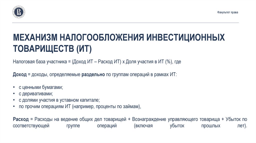 Налоговая база участника = (Доход ИТ – Расход ИТ) x Доля участия в ИТ (%), где