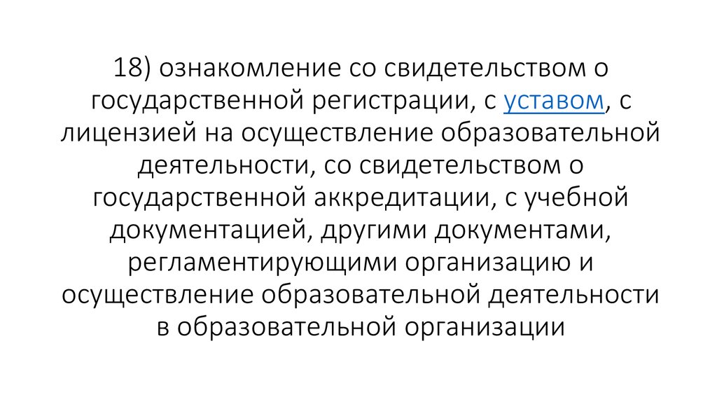 18) ознакомление со свидетельством огосударственной регистрации, с уставом, с