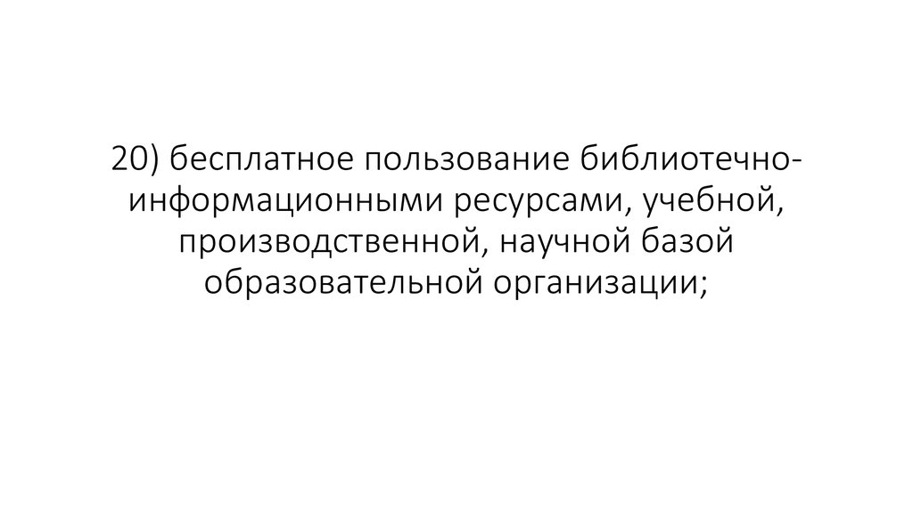 20) бесплатное пользование библиотечноинформационными ресурсами, учебной,производственной, научной базой