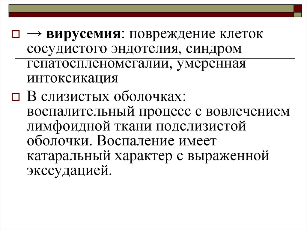 → вирусемия: повреждение клетоксосудистого эндотелия, синдром