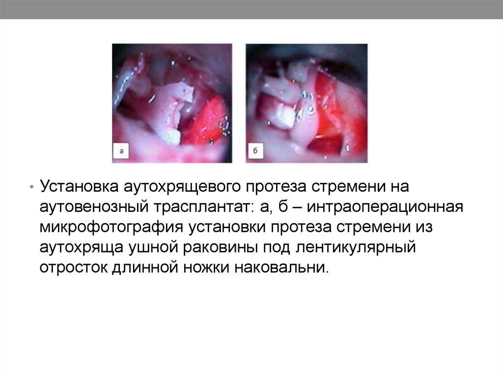 • Установка аутохрящевого протеза стремени нааутовенозный трасплантат: а, б – интраоперационная