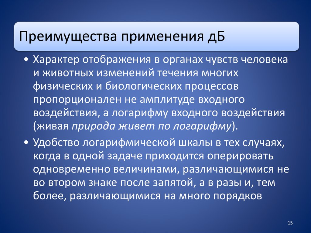 Преимущества применения дБ• Характер отображения в органах чувств человека