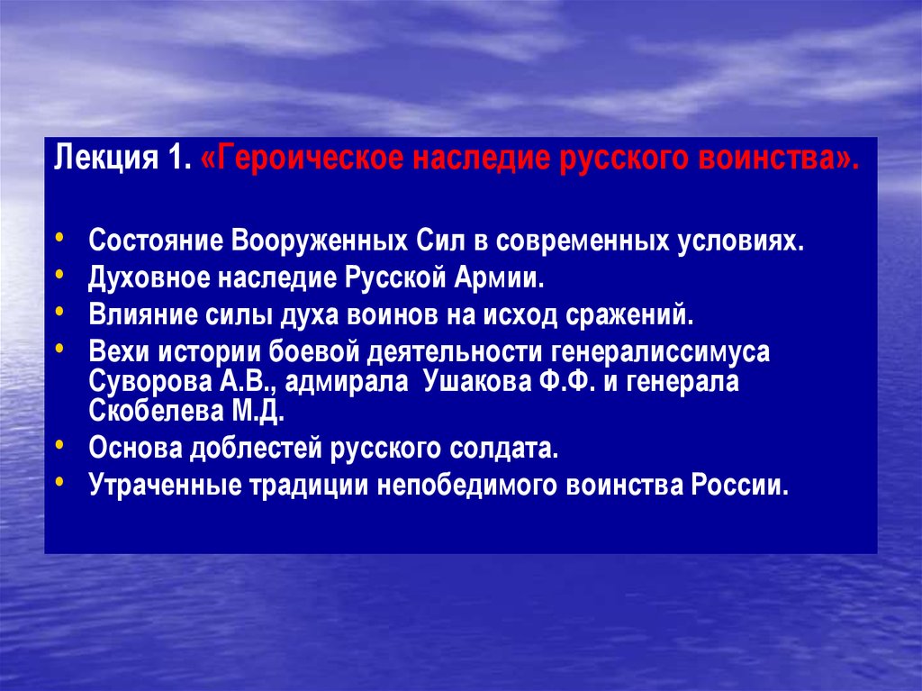 Лекция 1. «Героическое наследие русского воинства».Состояние Вооруженных Сил в современных условиях.