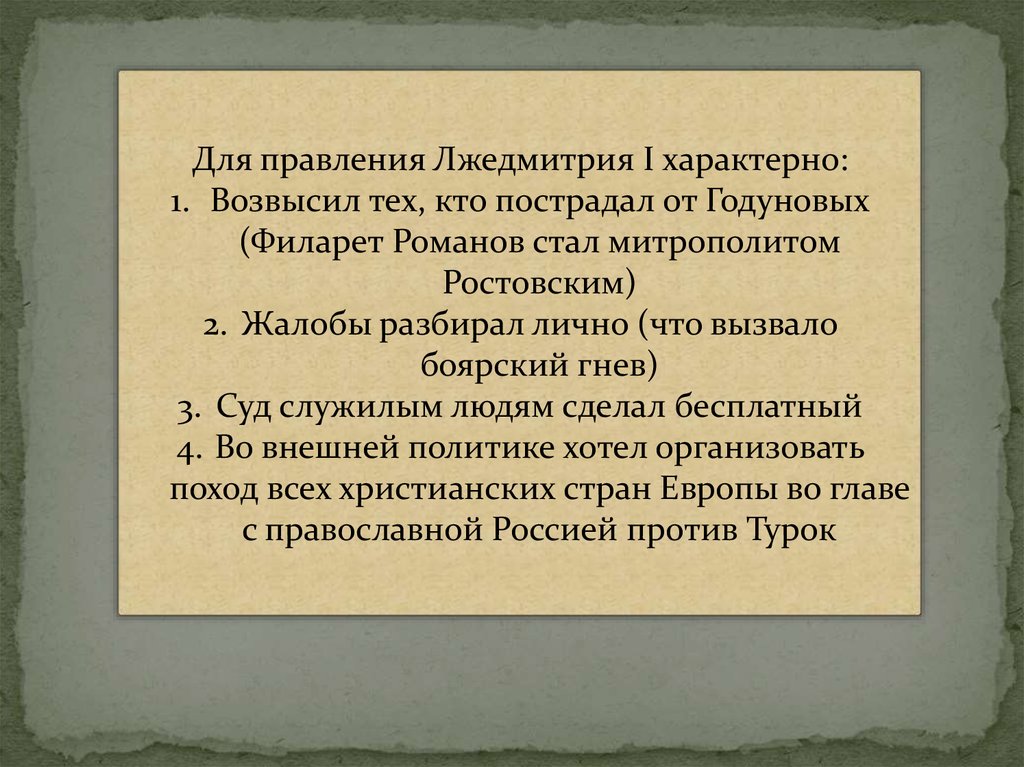Для правления Лжедмитрия I характерно:1. Возвысил тех, кто пострадал от Годуновых