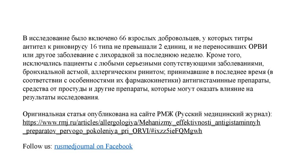 В исследование было включено 66 взрослых добровольцев, у которых титрыантител к риновирусу 16 типа не превышали 2 единиц, и не переносивших ОРВИ