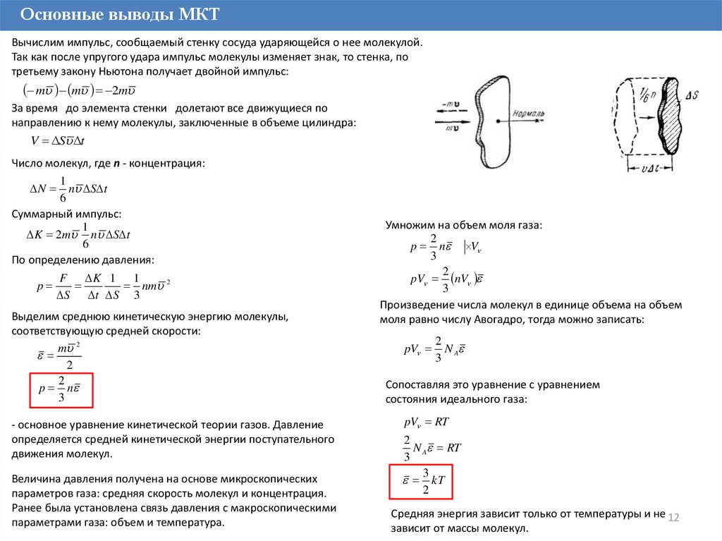 Основные выводы МКТВычислим импульс, сообщаемый стенку сосуда ударяющейся о нее молекулой.