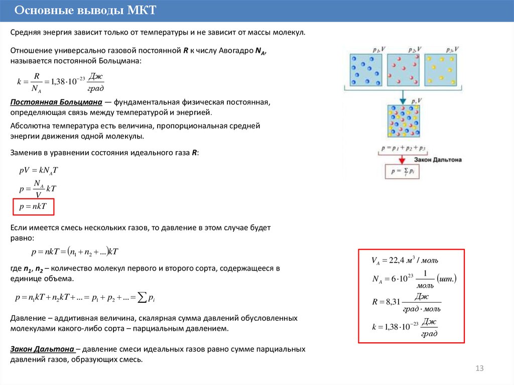 Основные выводы МКТСредняя энергия зависит только от температуры и не зависит от массы молекул.