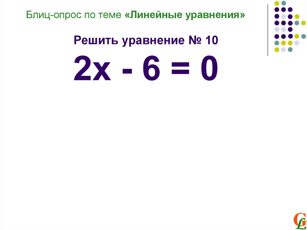 1. Тема «Линейные уравнения»: блиц-опрос Назначение презентации: контроль знаний