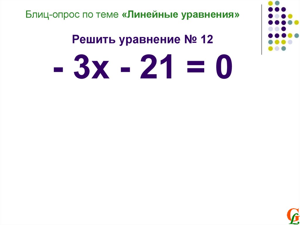 Блиц-опрос по теме «Линейные уравнения»Решить уравнение № 12