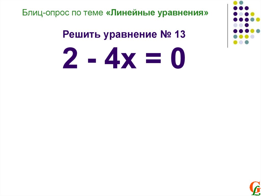 Блиц-опрос по теме «Линейные уравнения»Решить уравнение № 13