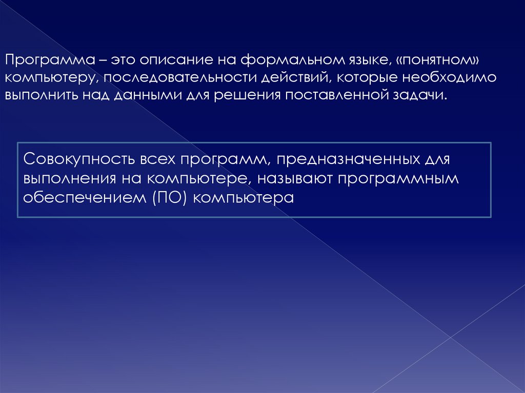 Программа – это описание на формальном языке, «понятном»компьютеру, последовательности действий, которые необходимо