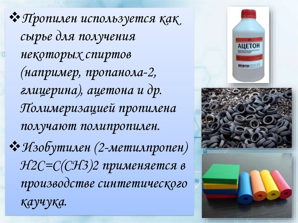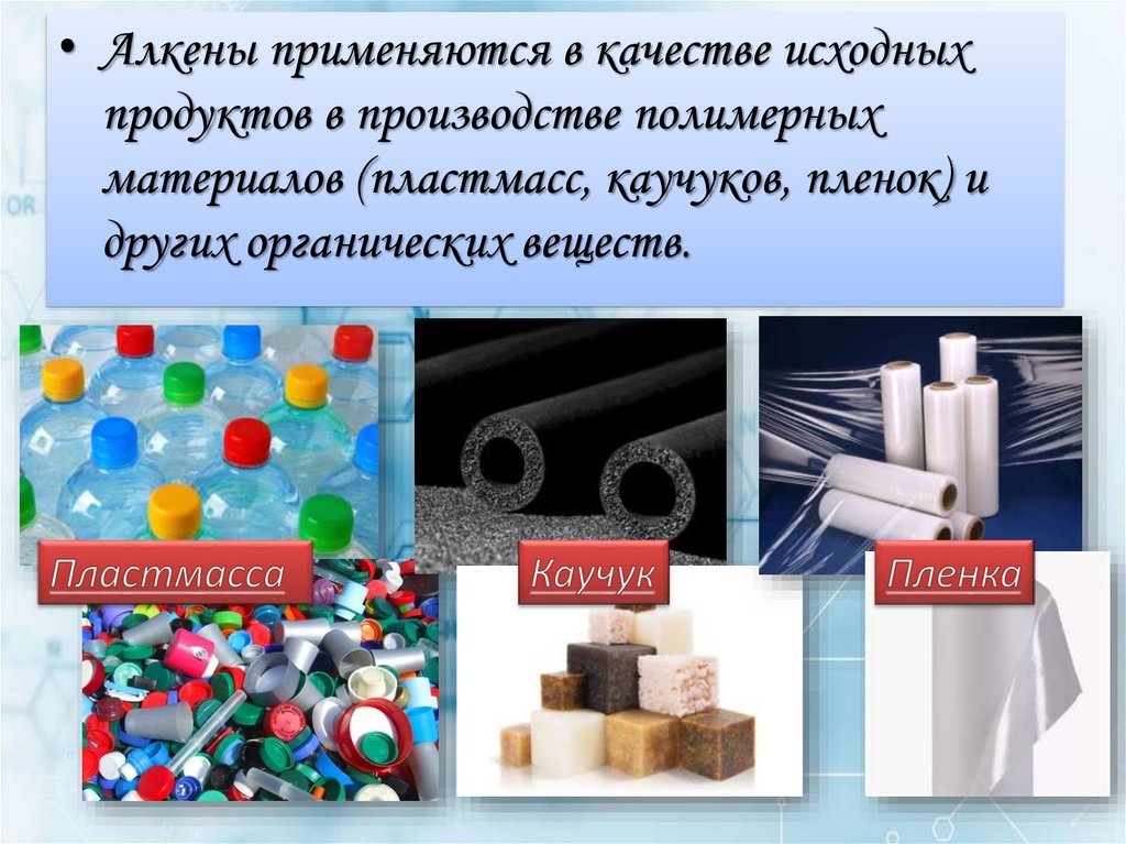 • Алкены применяются в качестве исходныхпродуктов в производстве полимерных
