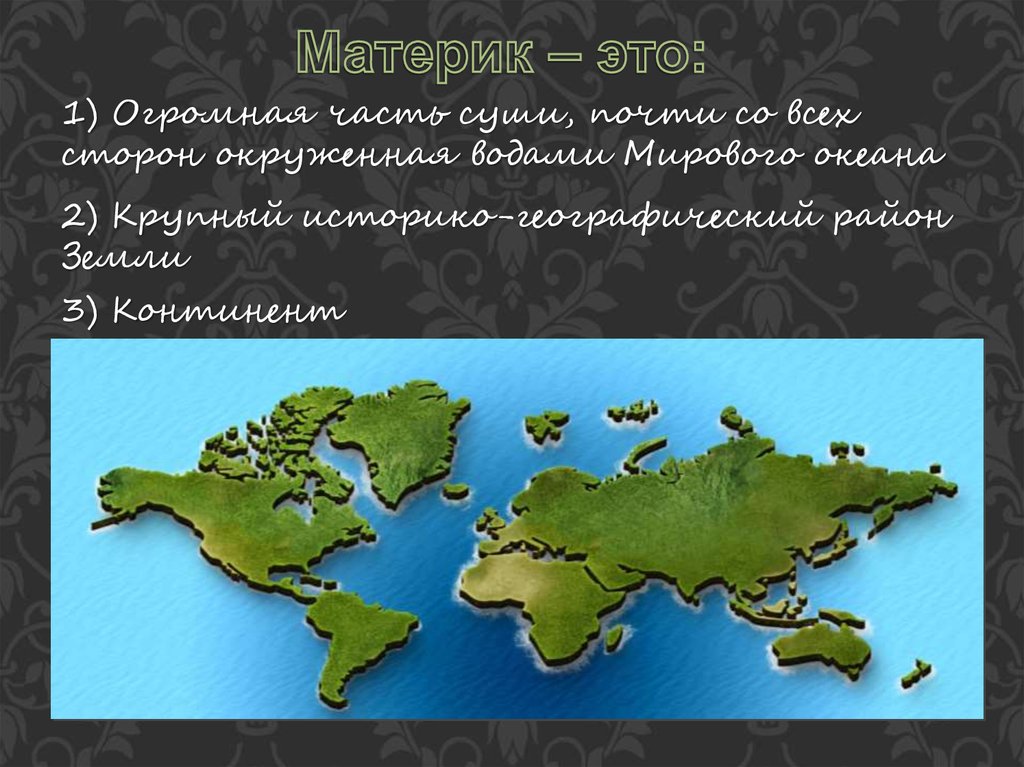 1) Огромная часть суши, почти со всехсторон окруженная водами Мирового океана