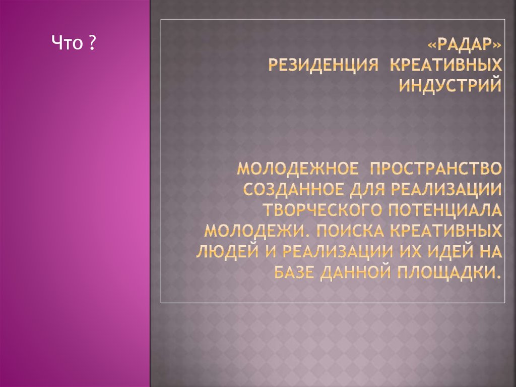 1. «Радар» Резиденция креативных индустрий молодежное пространство созданное для реализации творческого потенциала молодежи.