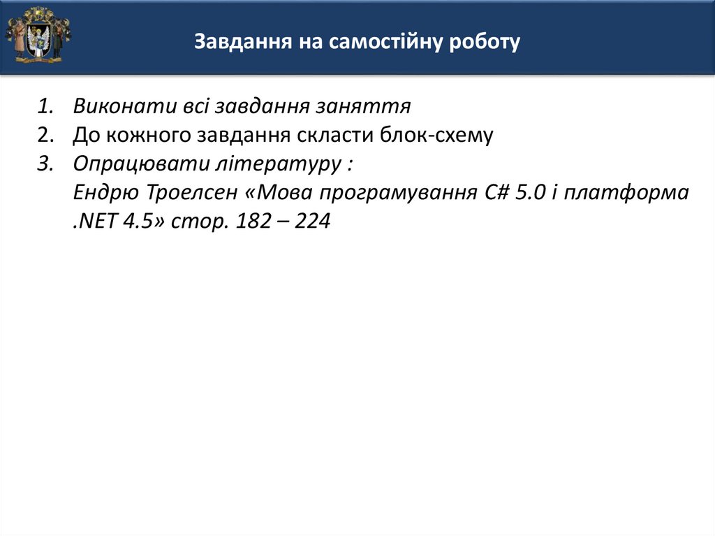 Завдання на самостійну роботу1. Виконати всі завдання заняття