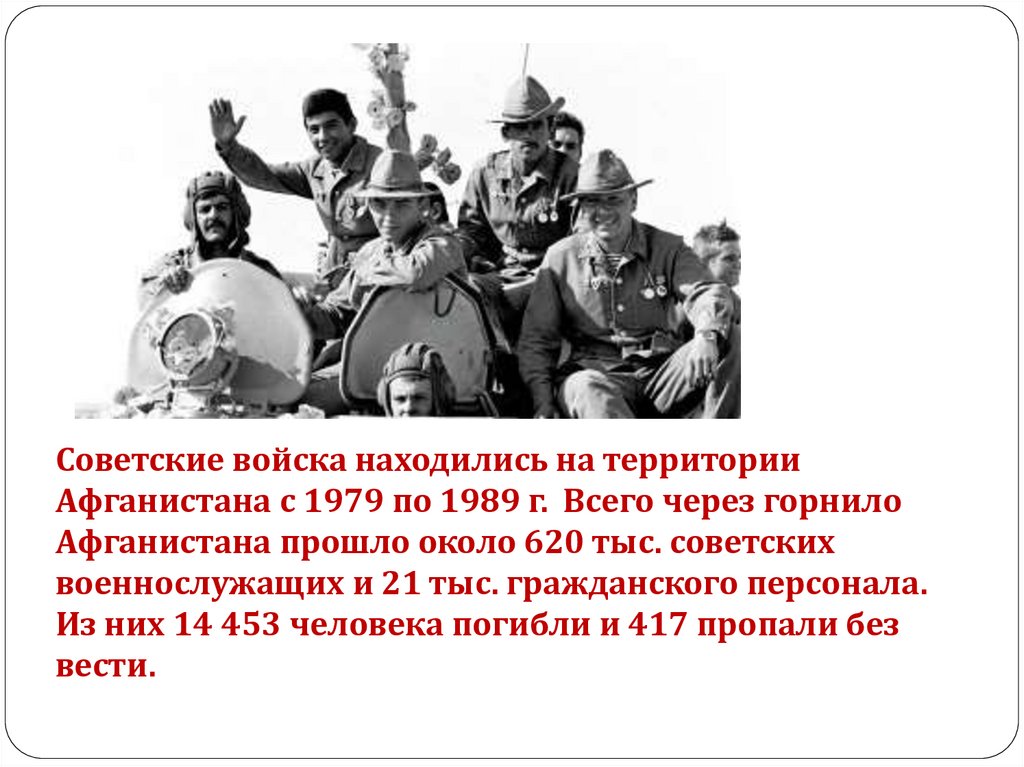 Советские войска находились на территорииАфганистана с 1979 по 1989 г. Всего через горнило