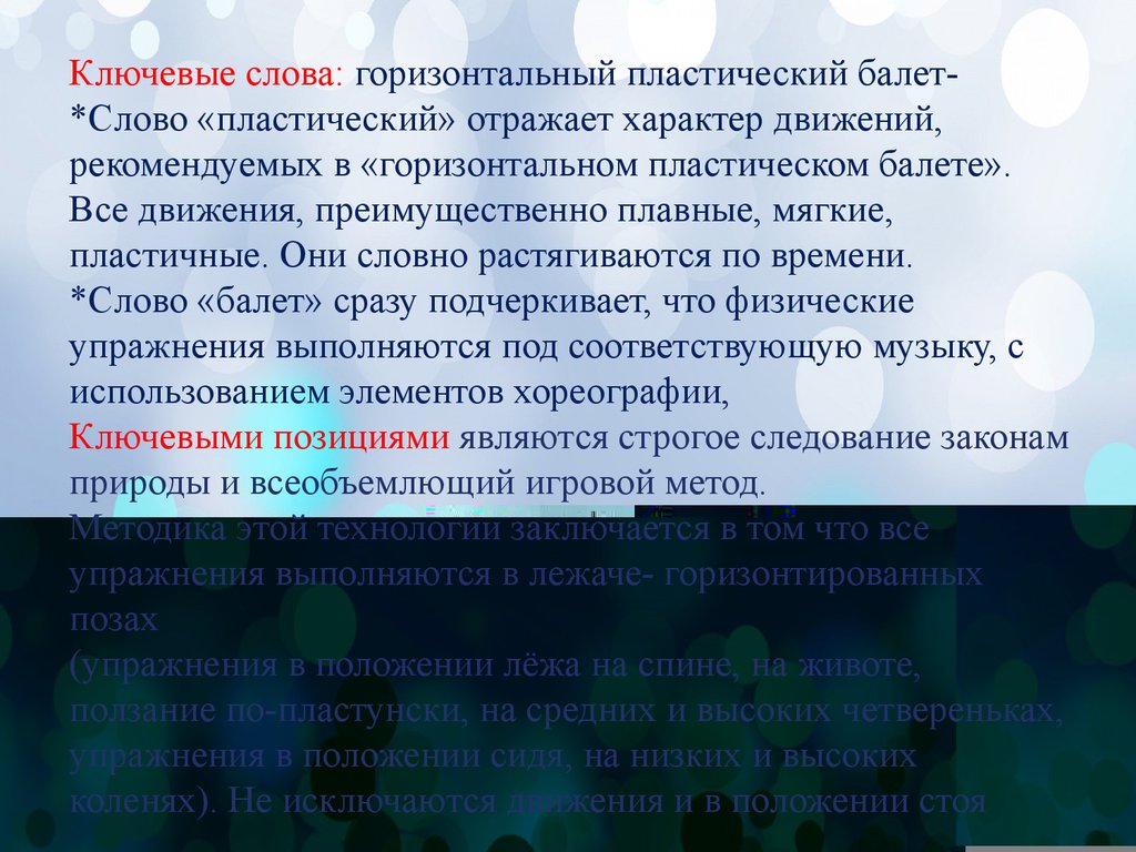 Ключевые слова: горизонтальный пластический балет*Слово «пластический» отражает характер движений,рекомендуемых в «горизонтальном пластическом балете».