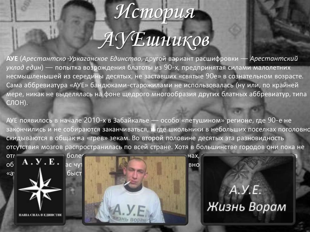 Сама аббревиатура «АУЕ» бандюками-старожилами не использовалась (ну или, по крайней