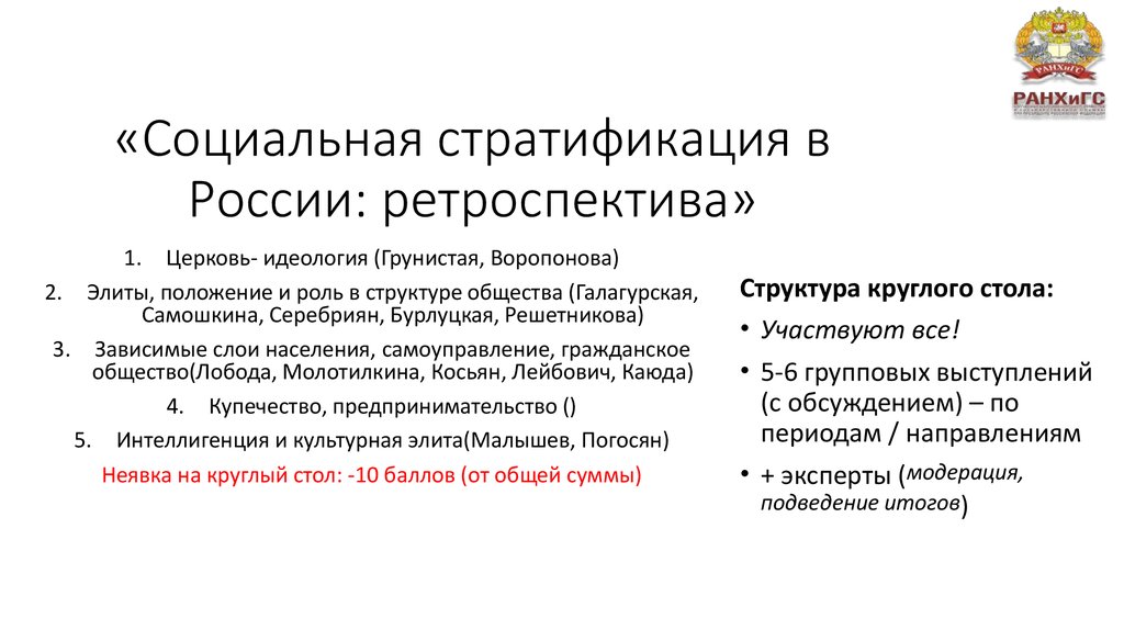 Неявка на круглый стол: -10 баллов (от общей суммы)