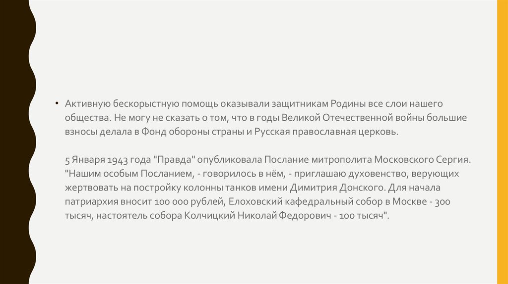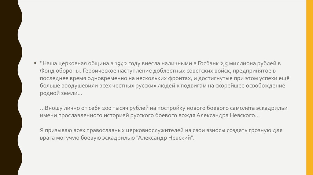• “Наша церковная община в 1942 году внесла наличными в Госбанк 2,5 миллиона рублей вФонд обороны. Героическое наступление доблестных советских войск, предпринятое в