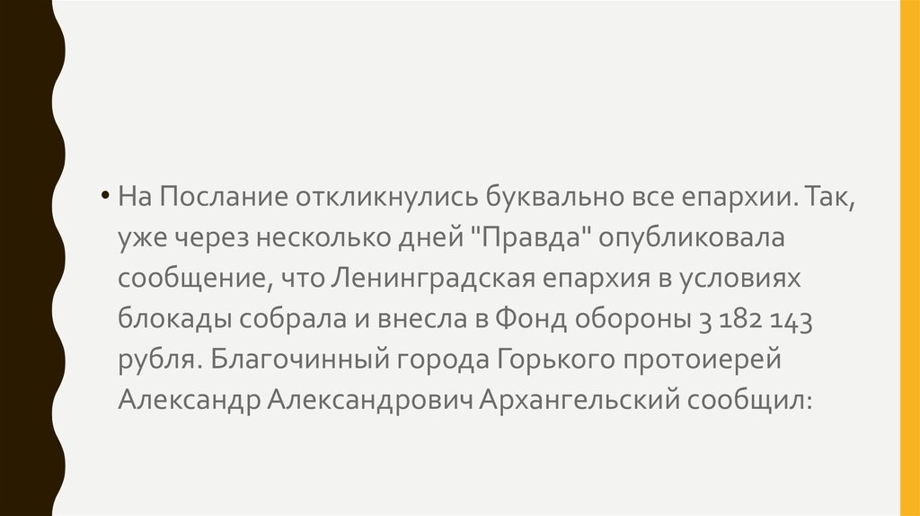 • На Послание откликнулись буквально все епархии. Так,уже через несколько дней "Правда" опубликовала