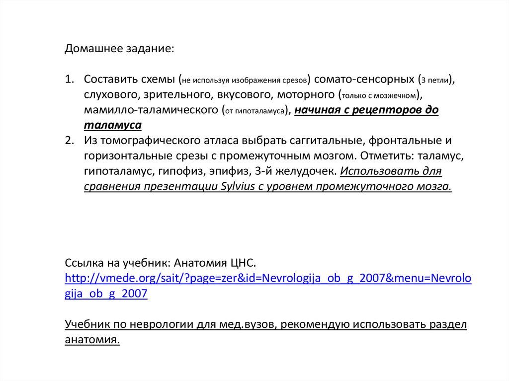 Домашнее задание:1. Составить схемы (не используя изображения срезов) сомато-сенсорных (3 петли),
