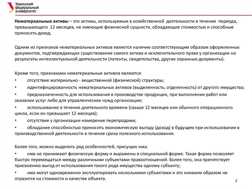 Нематериальные активы – это активы, используемые в хозяйственной деятельности в течение периода,превышающего 12 месяцев, не имеющие физической сущности, обладающие стоимостью и способные