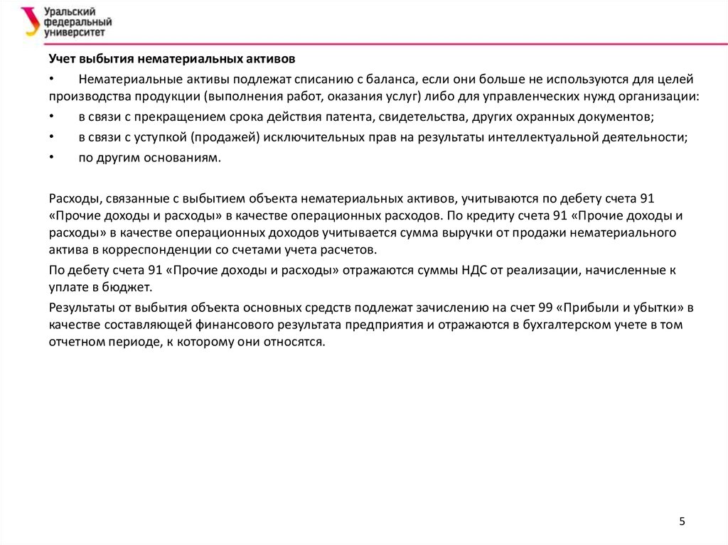 Учет выбытия нематериальных активовНематериальные активы подлежат списанию с баланса, если они больше не используются для целей