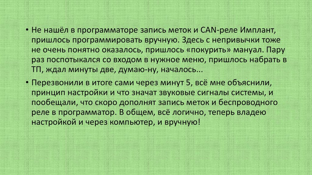 • Не нашёл в программаторе запись меток и CAN-реле Имплант,пришлось программировать вручную. Здесь с непривычки тоже