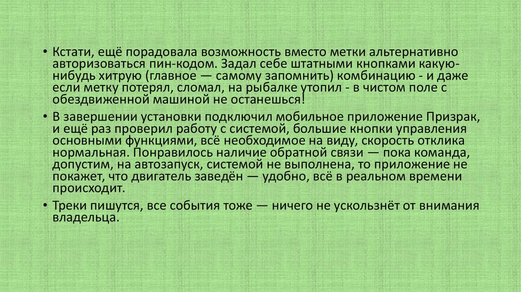 • Кстати, ещё порадовала возможность вместо метки альтернативноавторизоваться пин-кодом. Задал себе штатными кнопками какуюнибудь хитрую (главное — самому запомнить) комбинацию - и даже