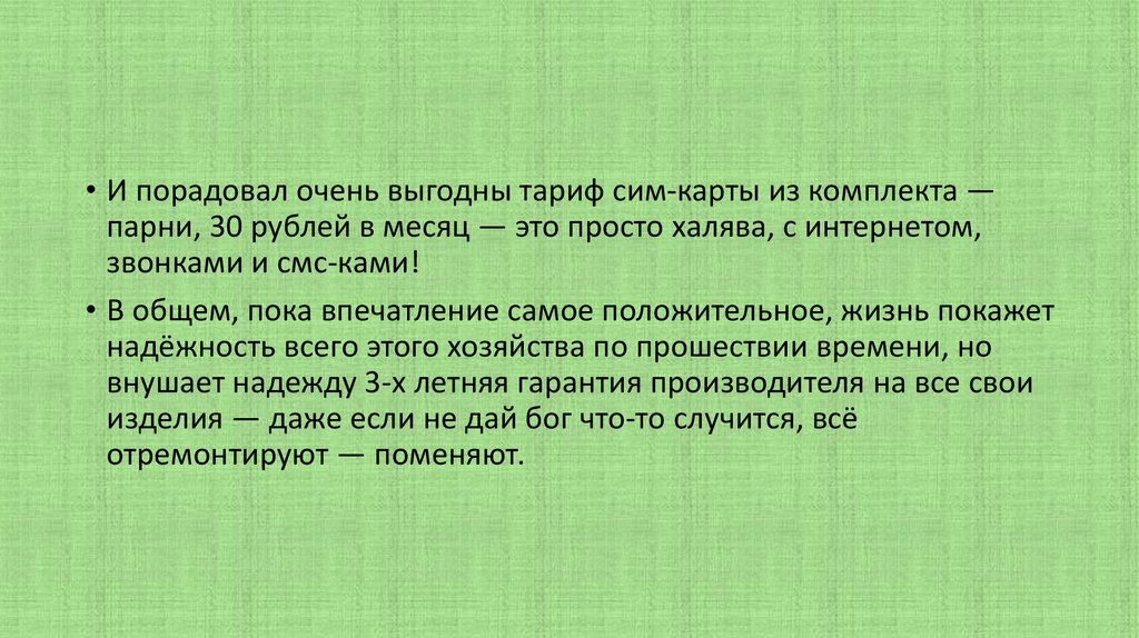 • И порадовал очень выгодны тариф сим-карты из комплекта —парни, 30 рублей в месяц — это просто халява, с интернетом,