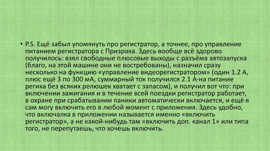 • P.S. Ещё забыл упомянуть про регистратор, а точнее, про управлениепитанием регистратора с Призрака. Здесь вообще всё здорово