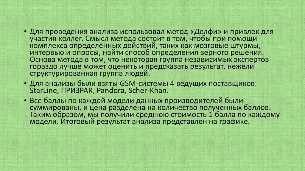 • Для проведения анализа использовал метод «Делфи» и привлек дляучастия коллег. Смысл метода состоит в том, чтобы при помощи