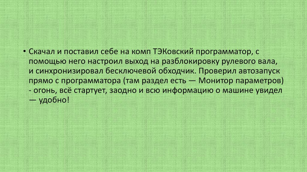 • Скачал и поставил себе на комп ТЭКовский программатор, спомощью него настроил выход на разблокировку рулевого вала,