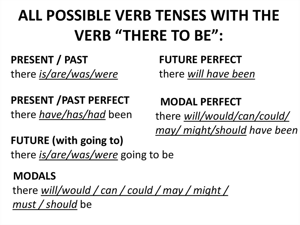 ALL POSSIBLE VERB TENSES WITH THEVERB “THERE TO BE”:
