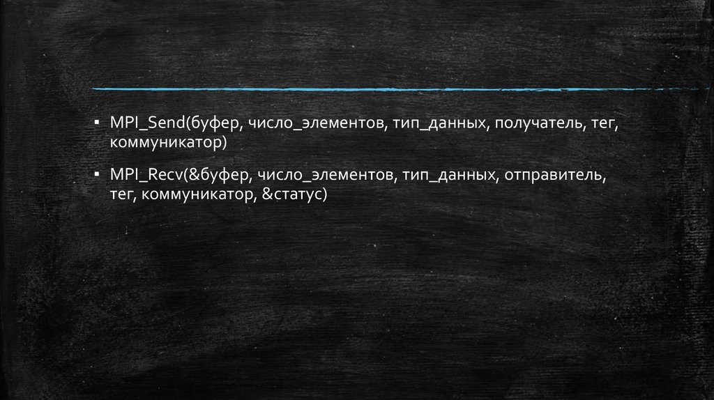 ▪ MPI_Recv(&буфер, число_элементов, тип_данных, отправитель,