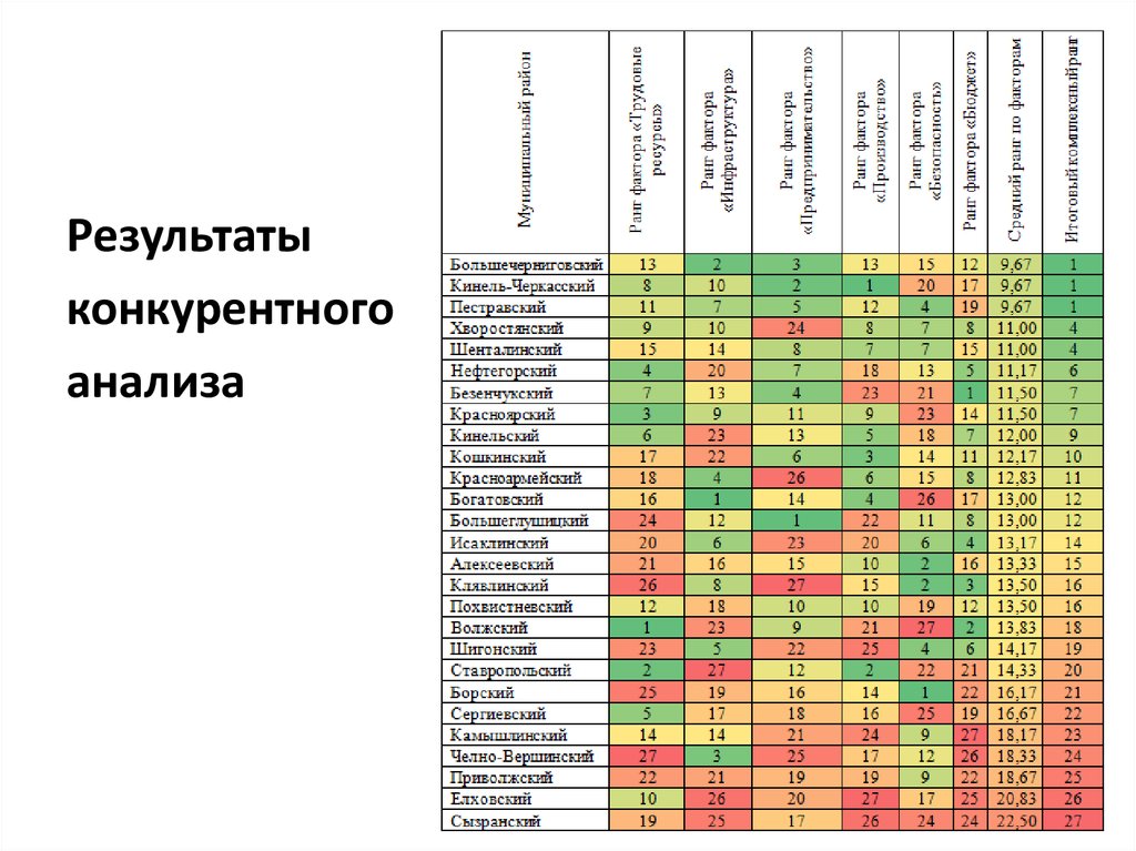 • расчет общего итогового индексаконкурентоспособности на основе ранжирования и
