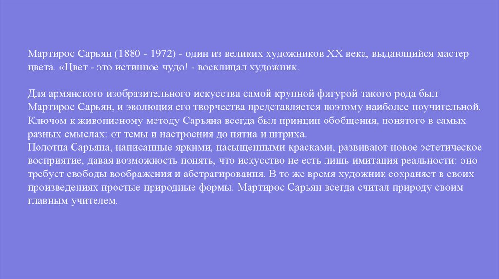 Мартирос Сарьян (1880 - 1972) - один из великих художников ХХ века, выдающийся мастерцвета. «Цвет - это истинное чудо! - восклицал художник.