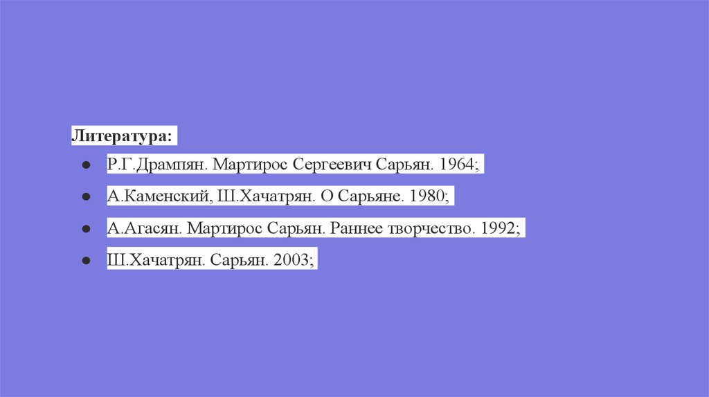 Литература:● Р.Г.Дрампян. Мартирос Сергеевич Сарьян. 1964;